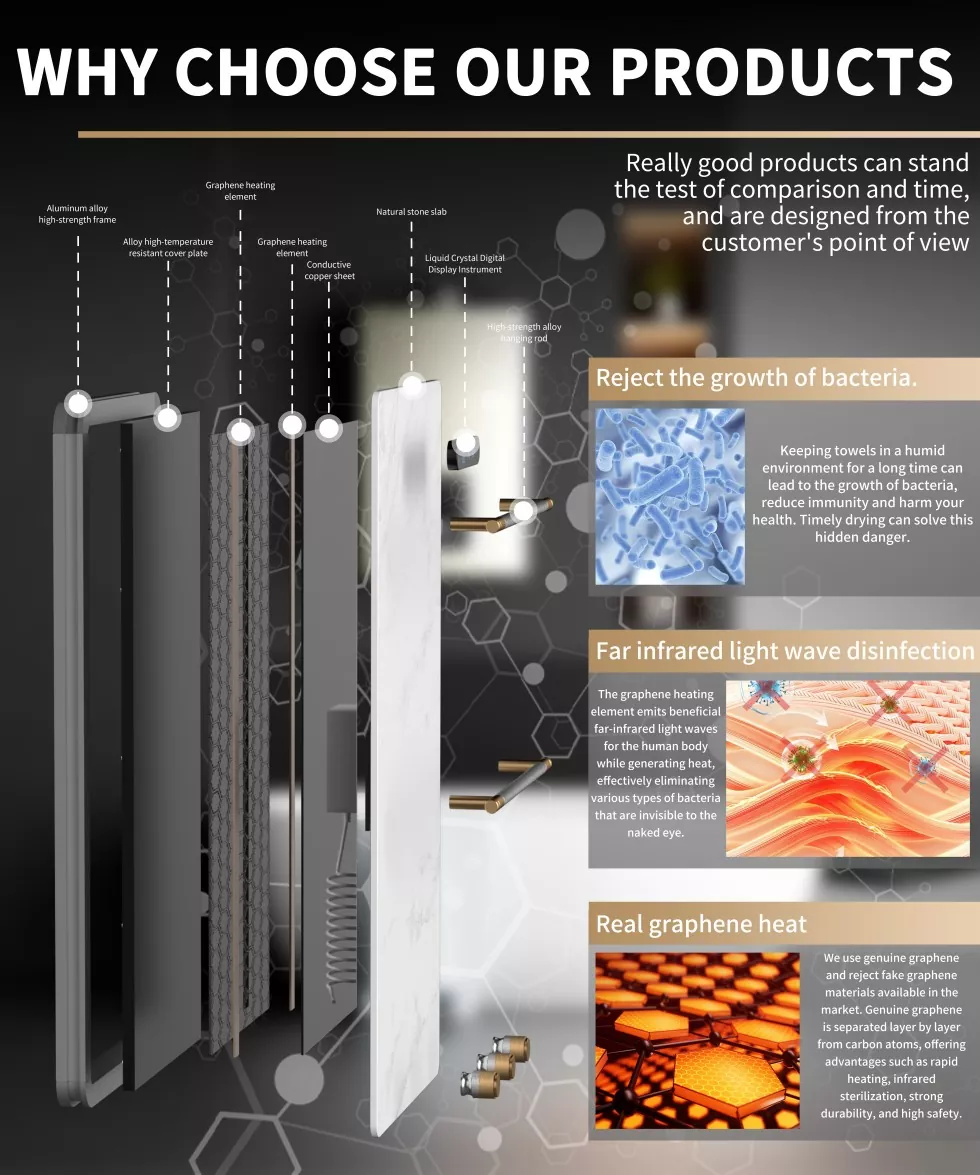 Grafeno beltzaren eskuoihal beltzak eskuoihalak lehortzen ditu, lehortasuna mantenduz eta hezetasunak sortutako bakterien eta moldeen hazkundea saihesten du, erabilera osasuntsuagoa sortuz. Bero-energia transferitzeko 4-16 m μ m-ko erradiazio erabilita, hala nola, staphylococus aureus bezalako bakterio kaltegarrien eraginkortasuna% 95ekoa da eta akaroa kentzeko efektua% 100ekoa da, bakterioen erreprodukzioa murriztea eta usainen agerraldia murriztea eta usainen agerraldia murriztuz.