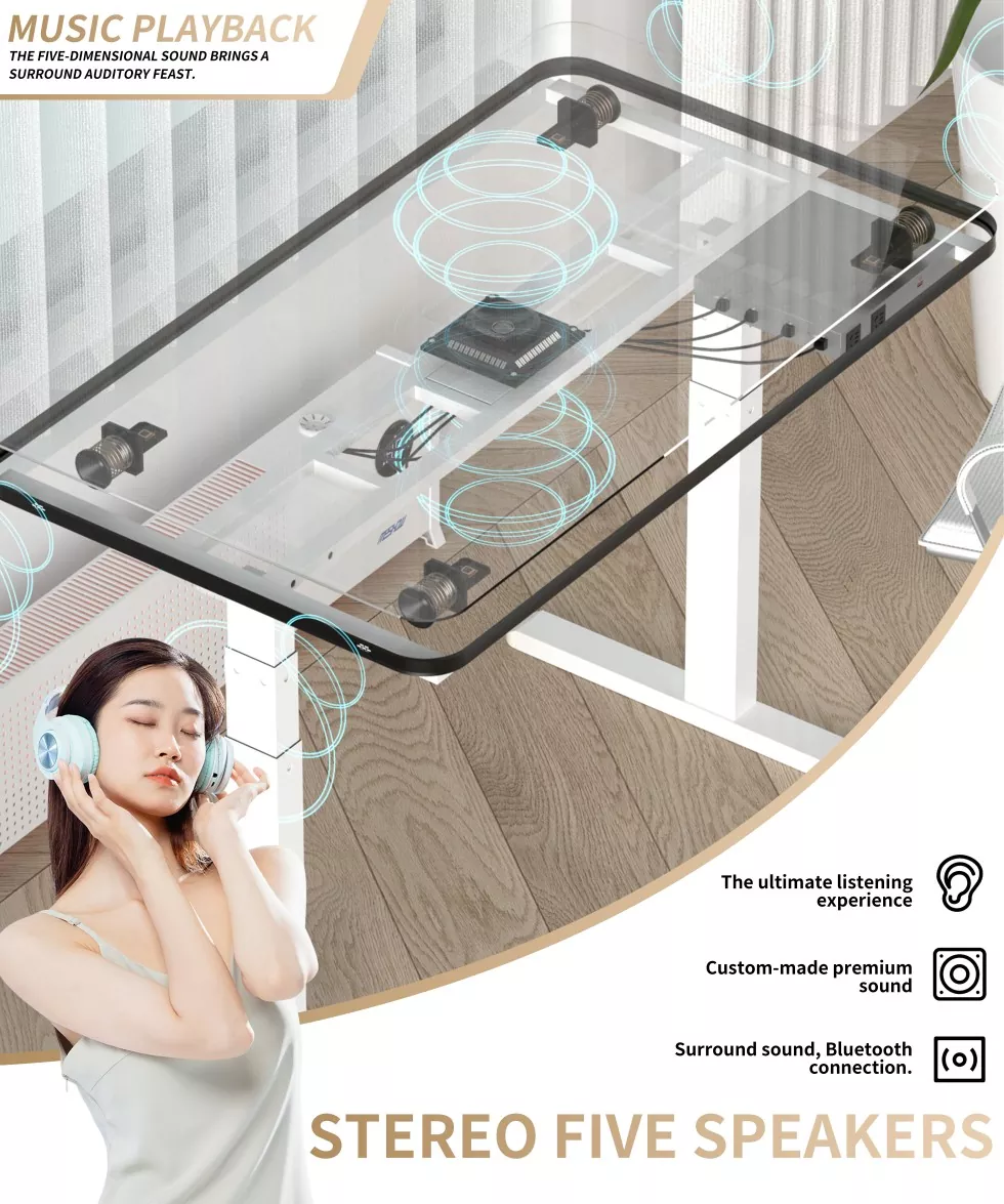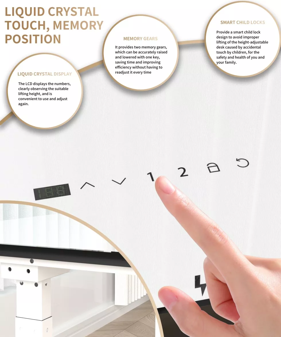 MELHOW-k kalitate handiko beirazko mahai gaineko alta elektrikoaren mahaia kaleratu du, punta-puntako motor teknologia bikoitza erabilita, altxatzeko leuna, azkarra eta isila ziurtatzeko. Mahaigaina kalitate handiko beirazko material zuriz egina dago, leuna eta iraunkorra da, estetika modernoa, garbitzeko erraza eta bulegoko inguruneetarako egokia da. Zutik edo eserita dagoen posizioan lan egitea, altxatzeko mahai elektrikoa ergonomikoki diseinatuta dago lan luzea eragindako osasun arazoak modu eraginkorrean arintzeko.